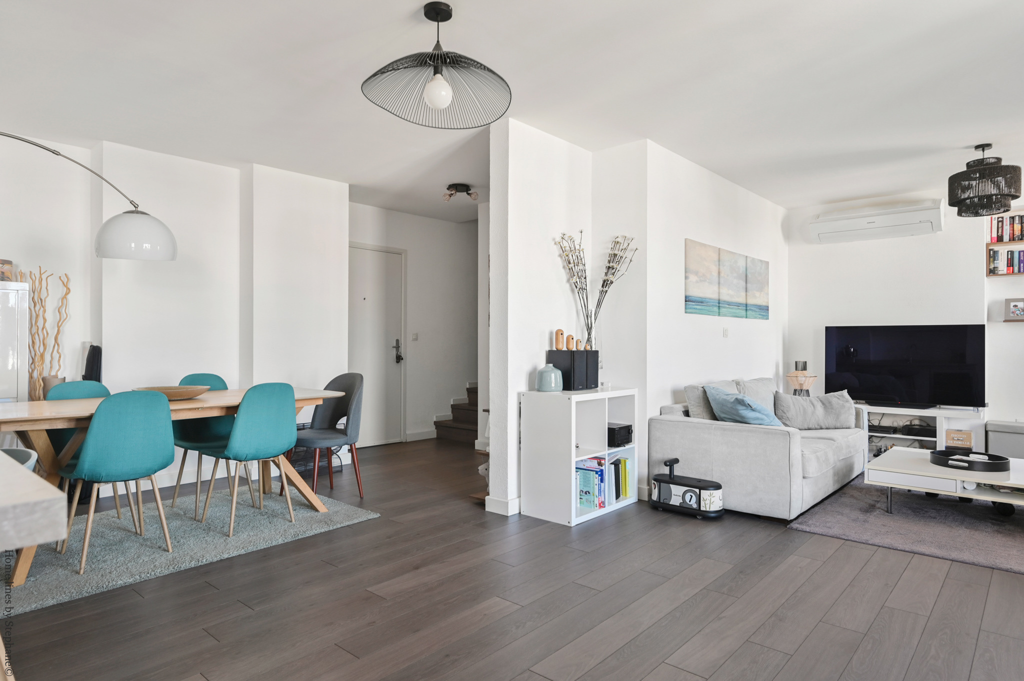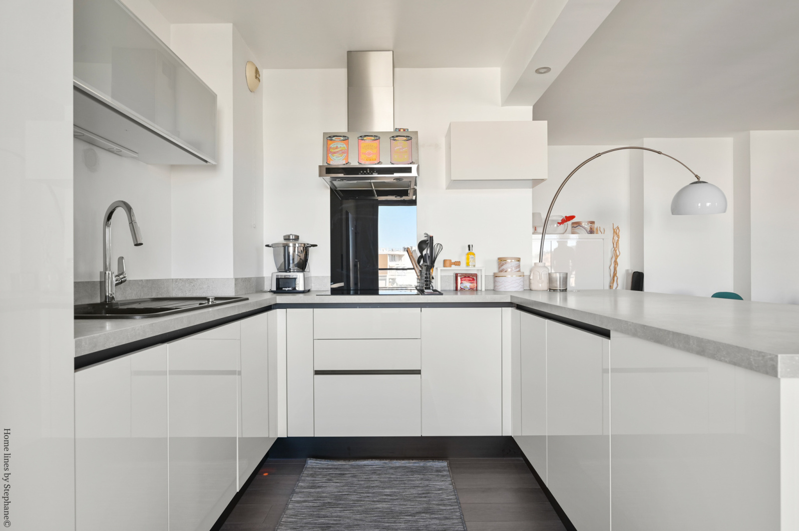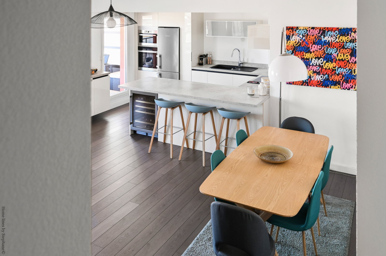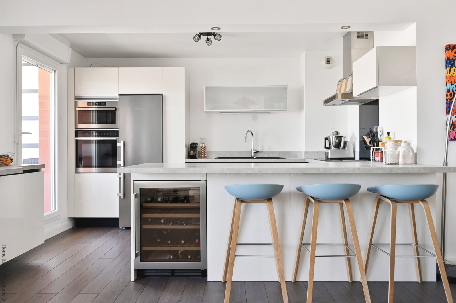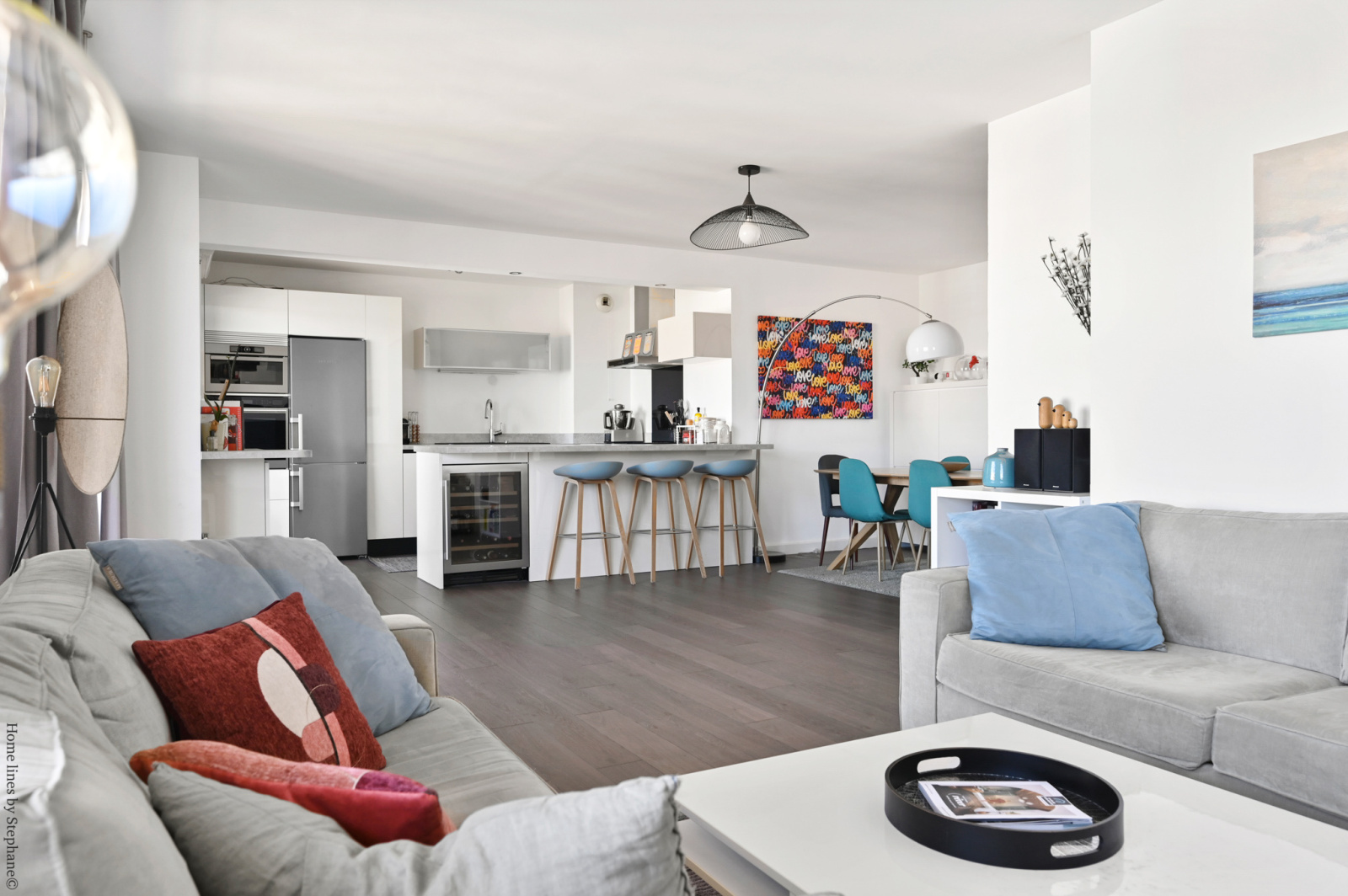 Au 9ème étage, salon séjour de 45 m2 avec une cuisine américaine récente équipée, une buanderie-salle d'eau, un toilette et une penderie.