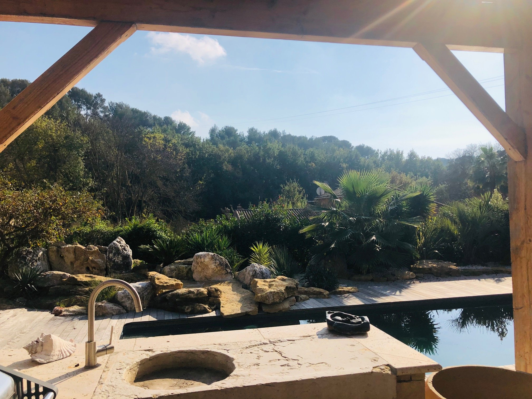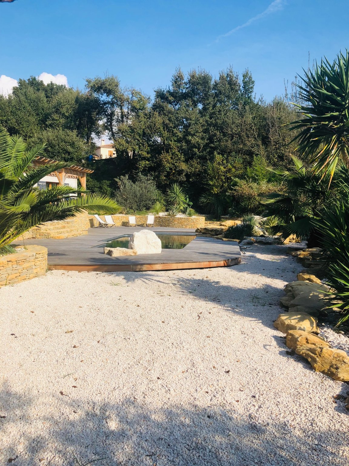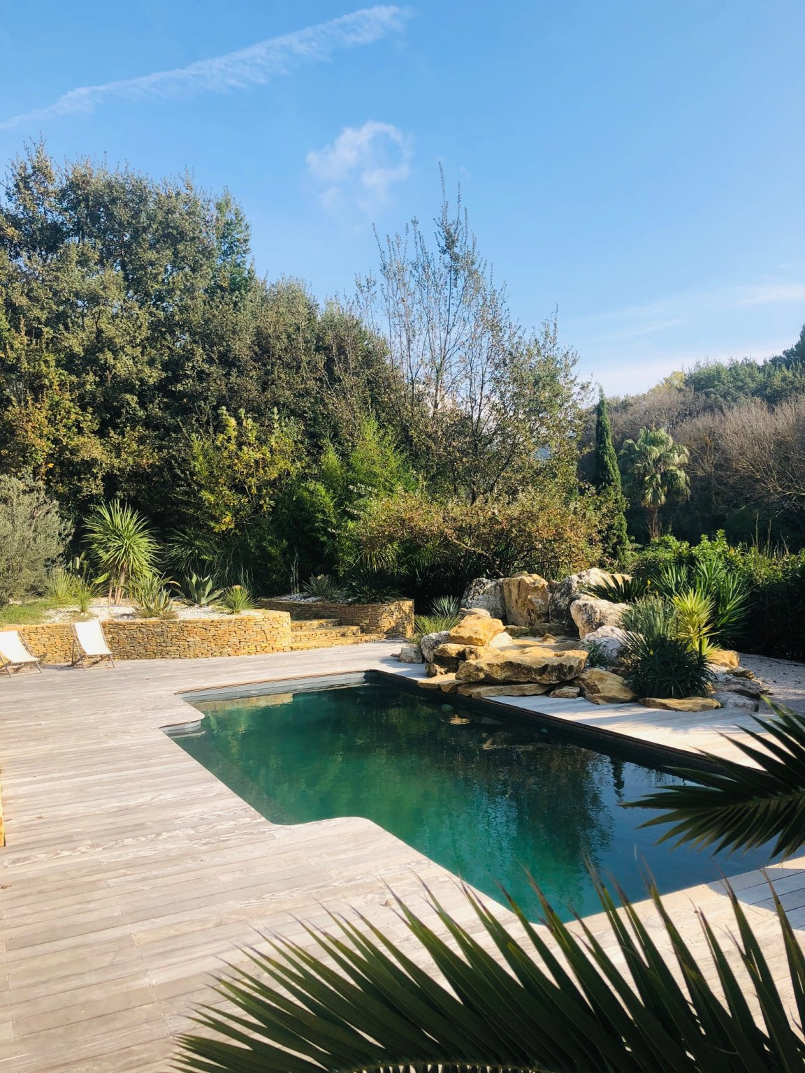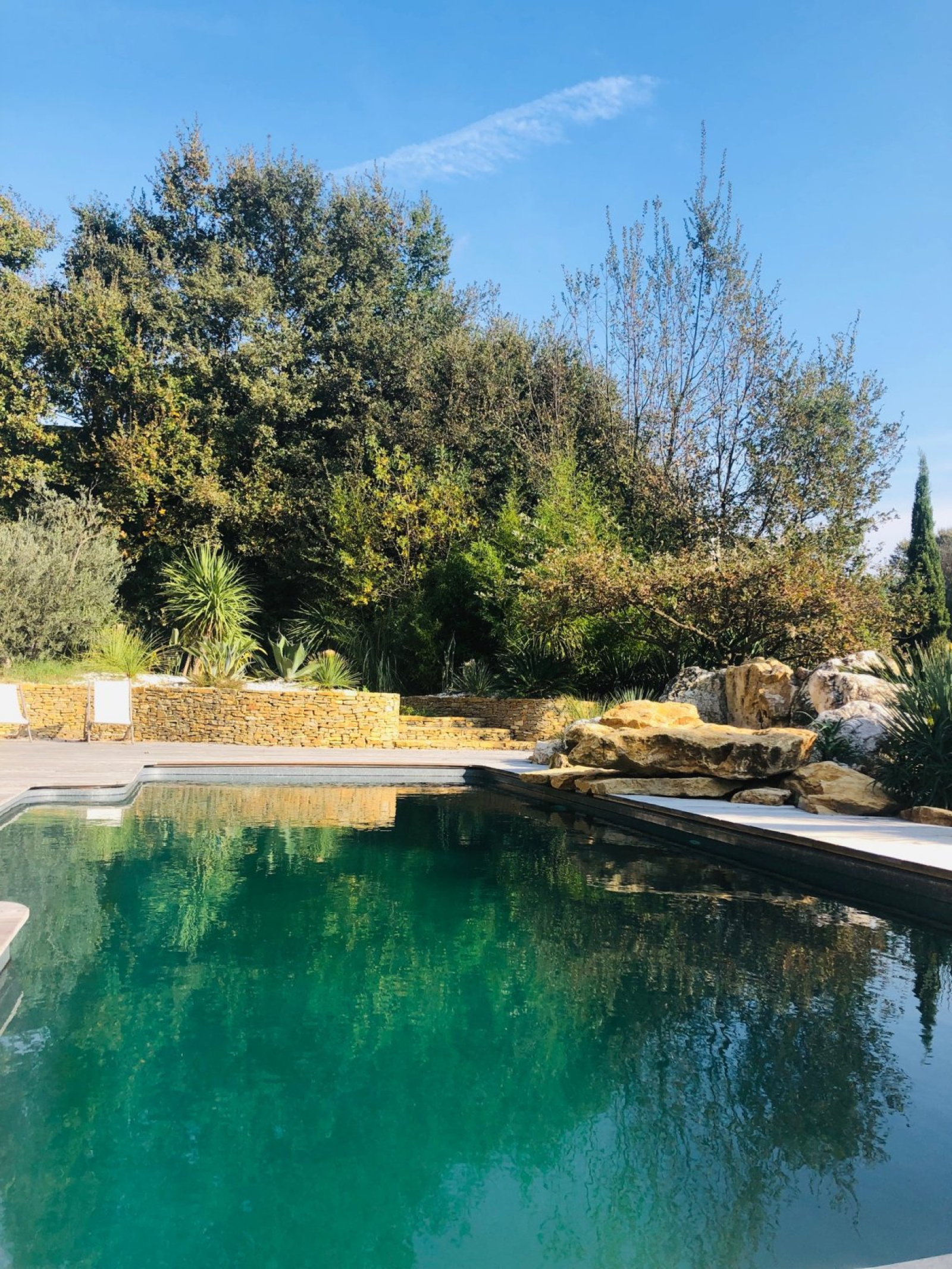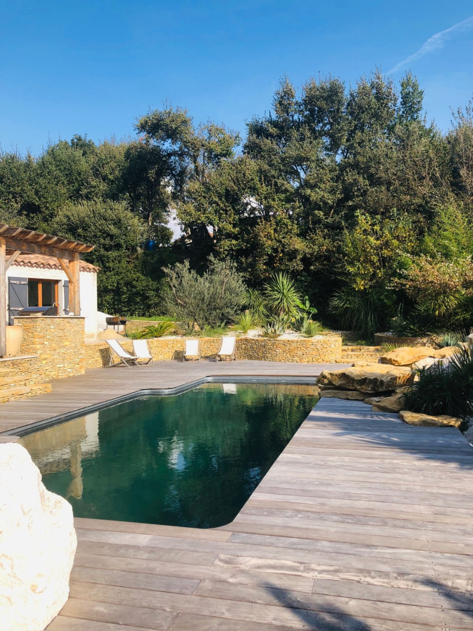 Grande terrasse exposée Sud Est donnant sur la très belle piscine 9x4.5 sans aucun vis-à-vis