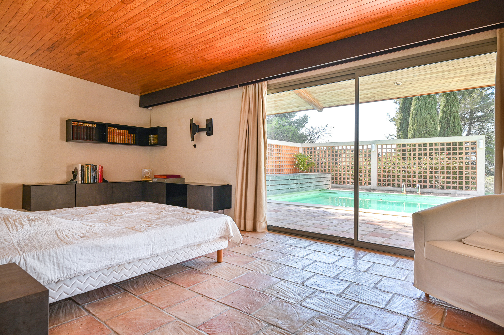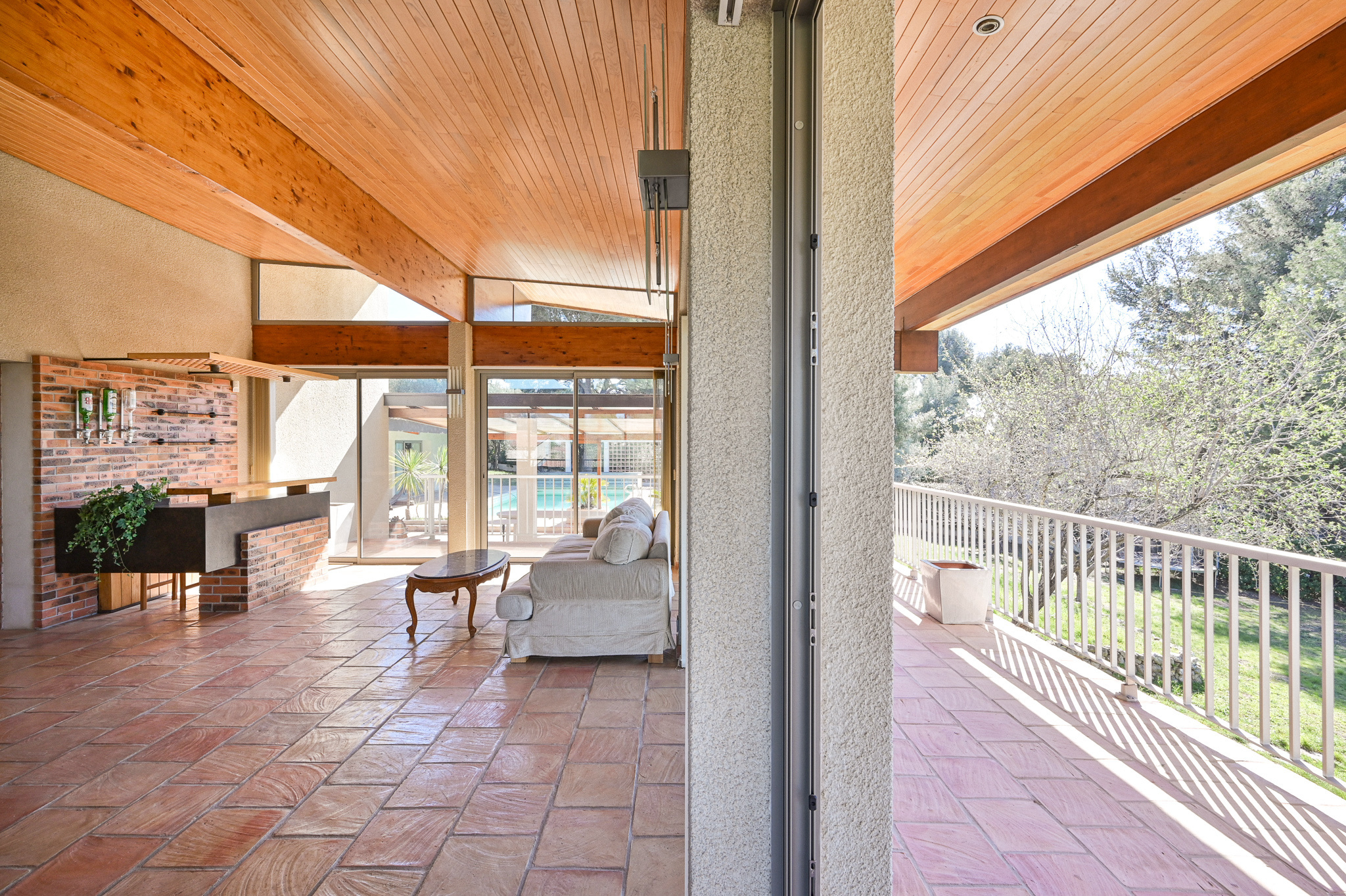En extérieur, terrain paysagé de 4520 m2 constructible, piscine chauffée avec nage à contre-courant bordée d'une terrasse de 150m2 et tennis.
