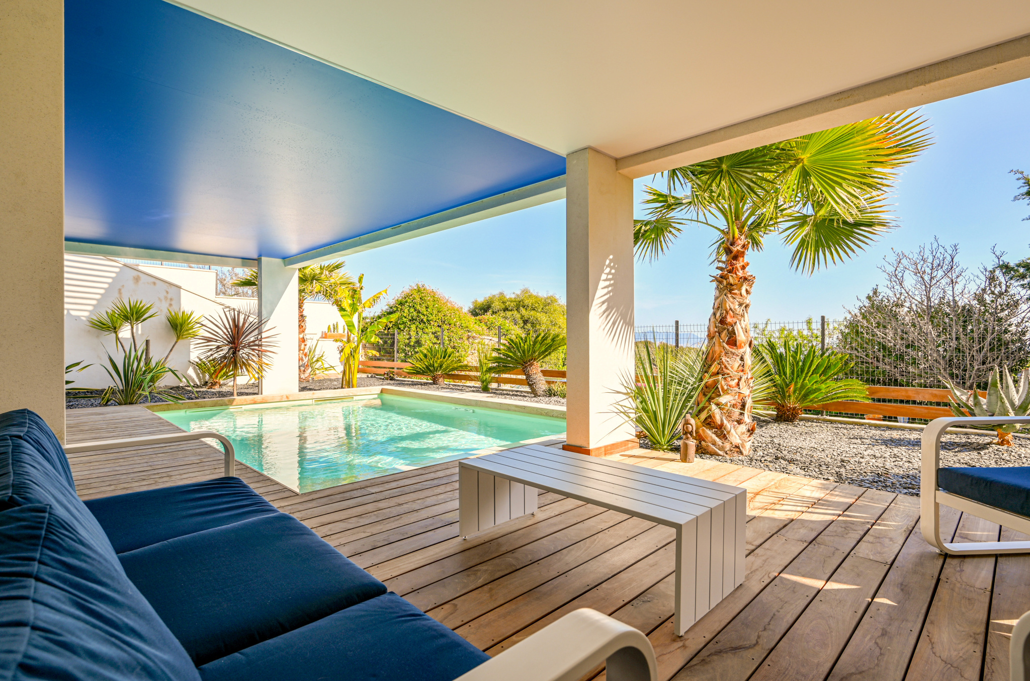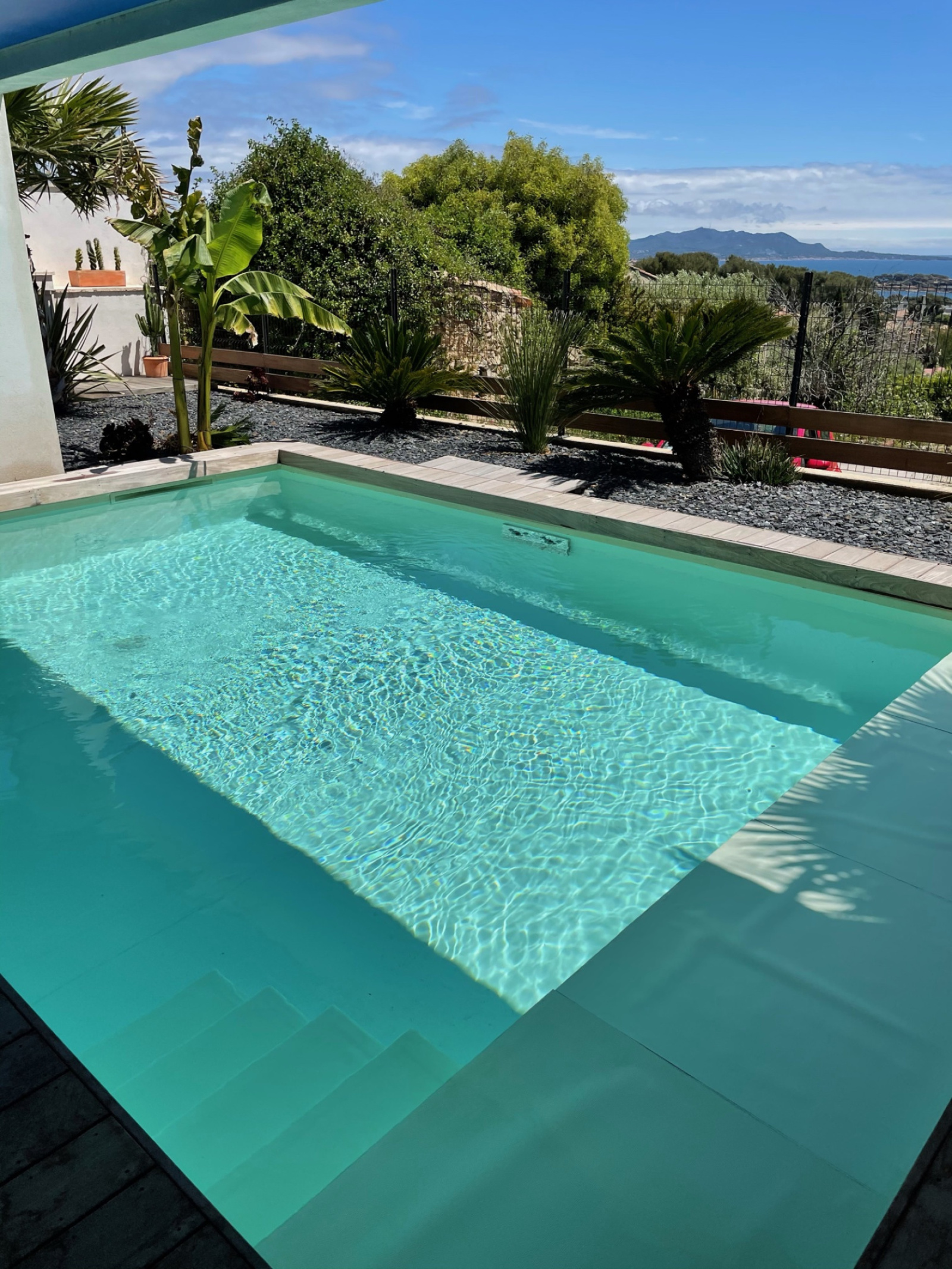 Une piscine chauffée avec nage à contre-courant entourée de diverses plantes méditerranéennes. Arrosage automatique réglable à distance.