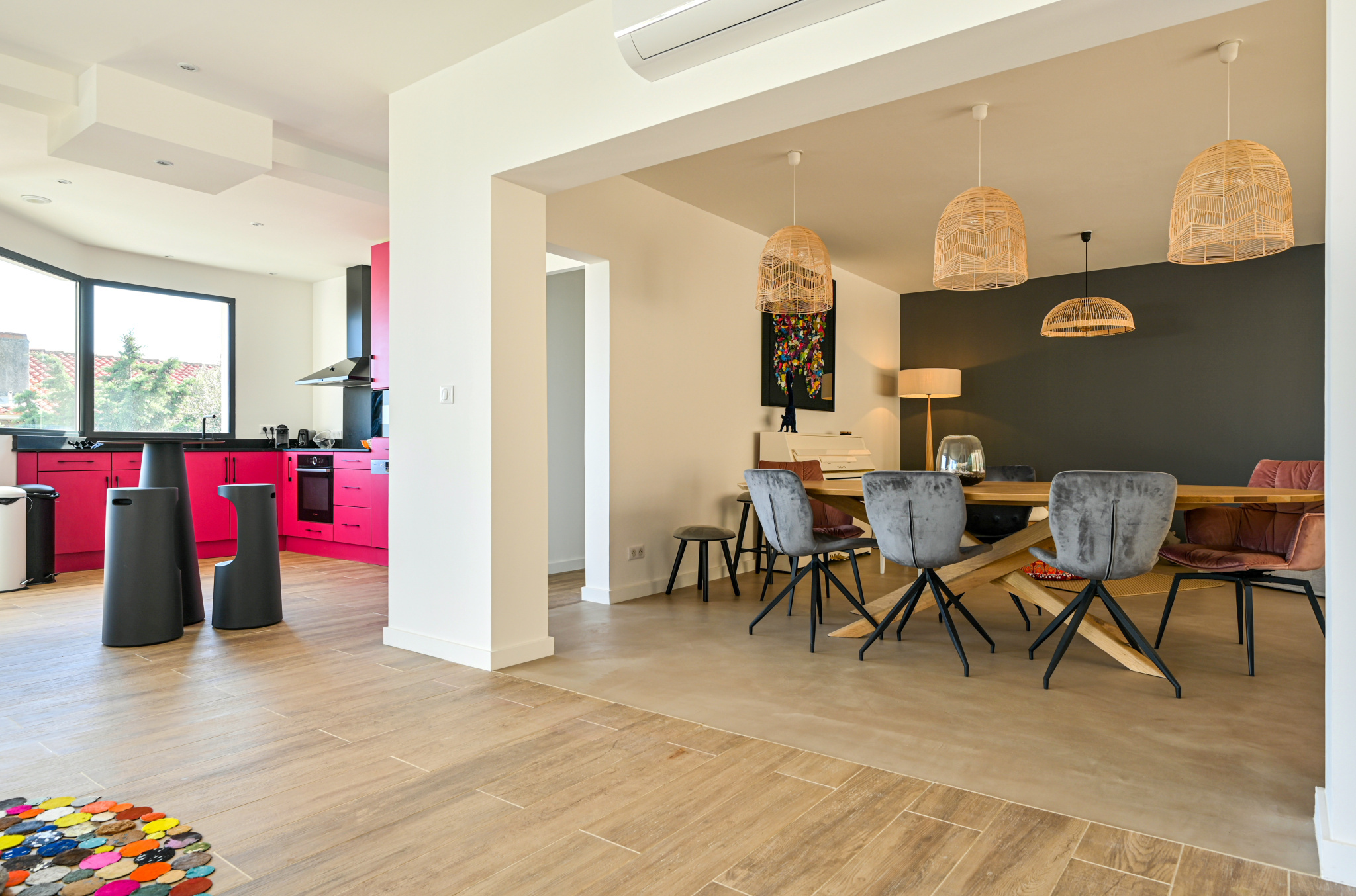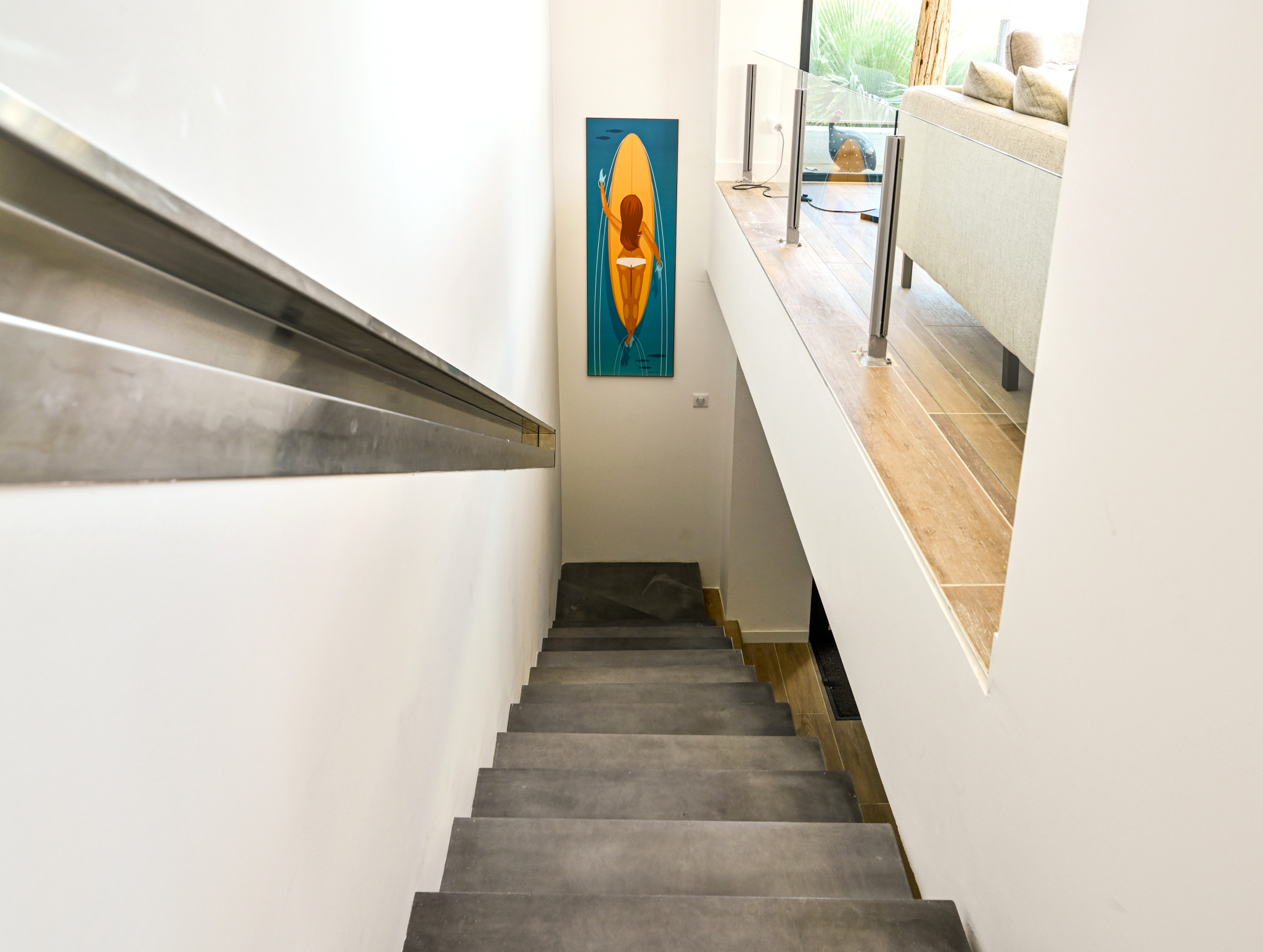En bas, on trouve 4 chambres chacune avec une ouverture sur l’extérieur, une salle de bains, une salle d’eau, une cave à vin, buanderie et local technique. Nombreux rangements. Climatisation dans toutes les pièces.