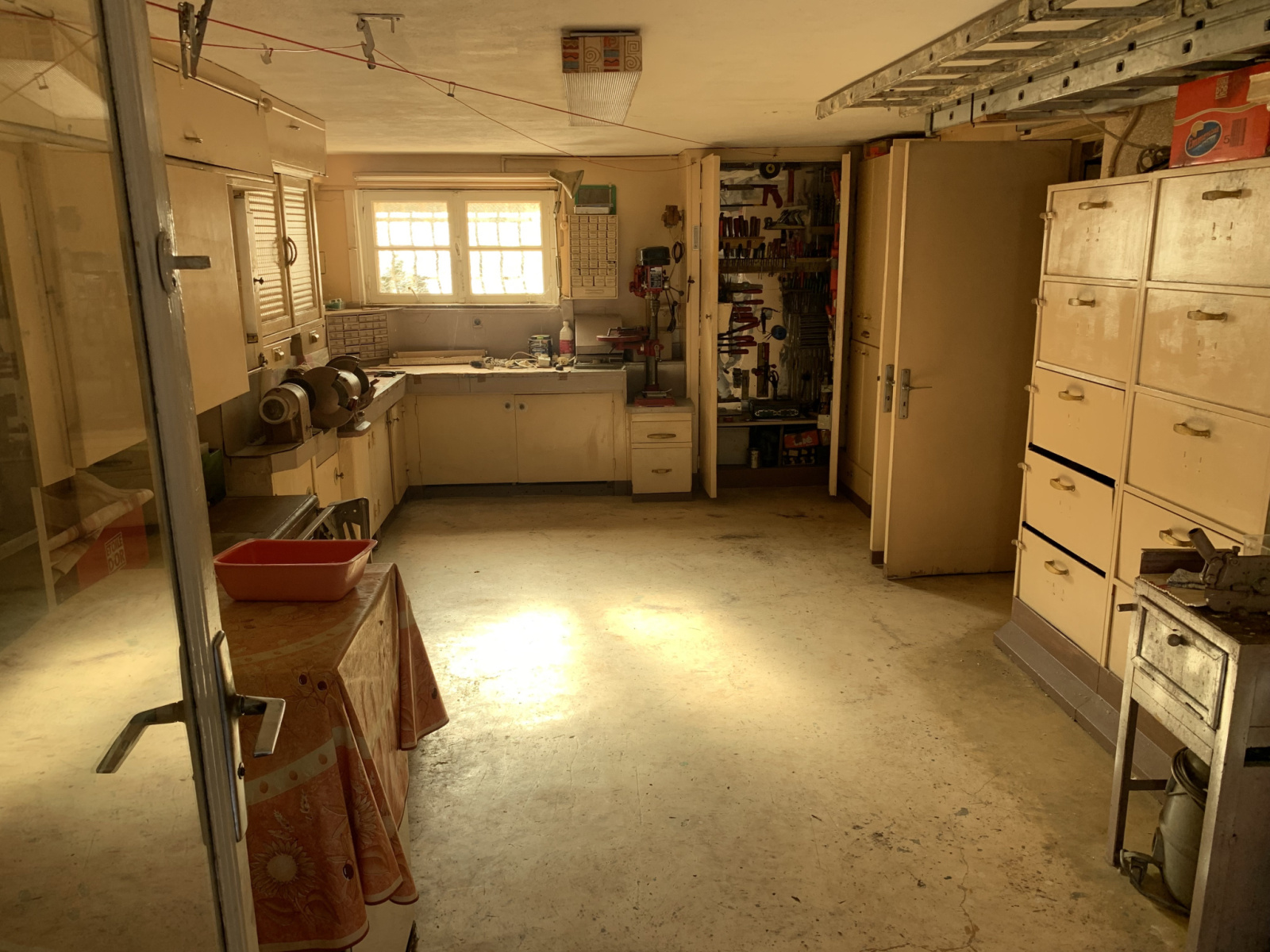 En RDJ, un garage, un grand atelier et des pièces donnant la possibilité de créer 2 chambres supplémentaires, une cuisine et une sdb avec entrée indépendante et donnant sur le jardin.